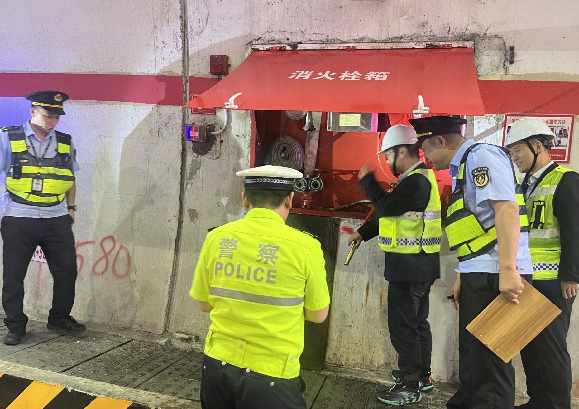 “這邊消防栓接口無松動,水壓達(dá)標(biāo)!”“應(yīng)急照明設(shè)備全部正常亮起!”在步丈嶺隧道內(nèi),綜合巡檢辦公室聯(lián)合交警、路政等一路多方人員,手持檢查記錄表,沿著隧道側(cè)壁逐點(diǎn)核查消防設(shè)施。大家分工協(xié)作,有的俯身檢查消防栓開關(guān)靈活性,有的核對設(shè)施巡檢記錄,現(xiàn)場交流處置流程、明確聯(lián)動職責(zé),讓應(yīng)急處置能力在實(shí)地測試中得到提升。