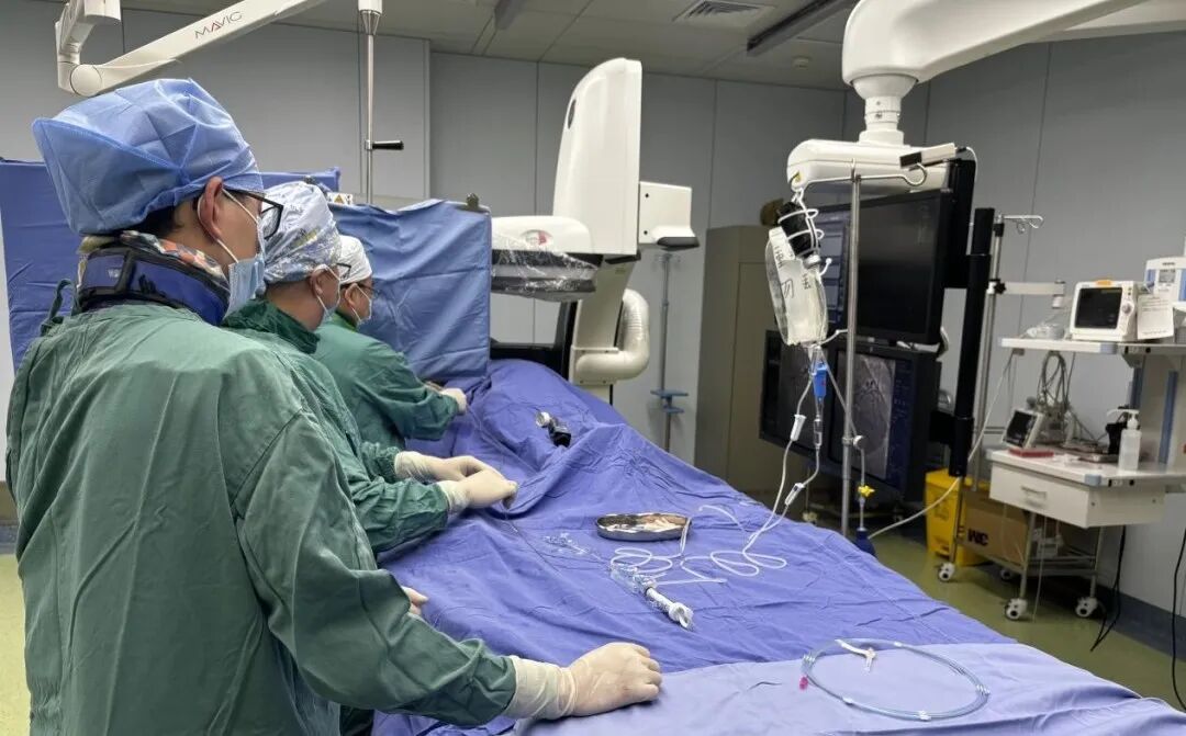 手術(shù)過程中,團隊精準把控每一個操作細節(jié):首先將一根指引導絲送至主血管遠端建立通道;隨后將一根頭端預先塑形成特定角度的導絲送入雙腔微導管,借助微導管提供的強支撐與精準導向,將導絲平穩(wěn)送至血管分叉“路口”。李朋憑借豐富的臨床經(jīng)驗與精細的操作技巧,通過一系列“回撤、反轉(zhuǎn)、旋轉(zhuǎn)、前送”的連貫動作,成功引導導絲頭端“拐過”銳利反折彎,精準探入對角支血管遠端真腔,順利建立起“生命軌道”。