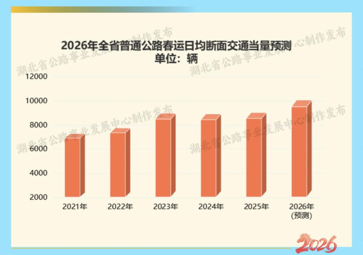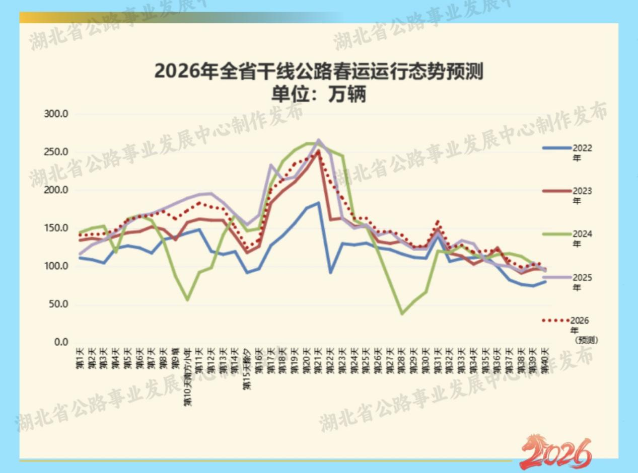 預(yù)判2026年春運(yùn)期間普通國省干線公路日均斷面交通當(dāng)量,與2024年春運(yùn)期間、2025年春運(yùn)期間基本持平。