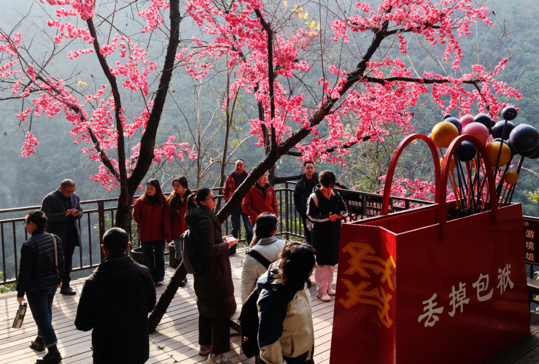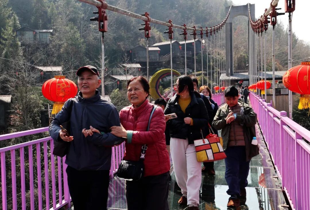 景區(qū)內,玻璃橋上歡呼聲此起彼伏,絕壁棧道上游客們舉家拍照打卡,地心谷底的潺潺流水與游客的歡聲笑語交織成一幅熱鬧的新春畫卷。