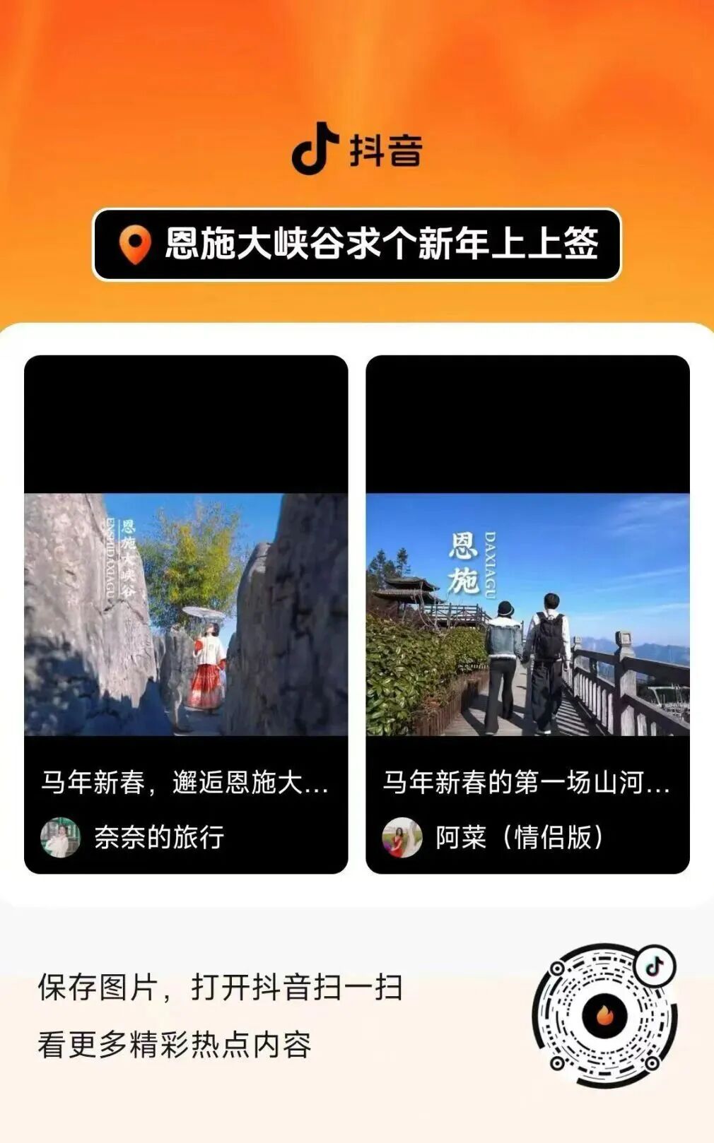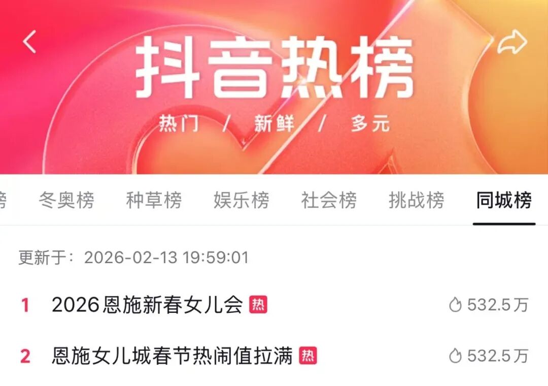#恩施新春女兒會(huì),#恩施女兒城春節(jié)熱鬧值拉滿(mǎn)成了抖音上最滾燙的話(huà)題,“年味藏在恩施山寨的美食里”的誘人畫(huà)面還歷歷在目,四大熱點(diǎn)事件霸榜抖音同城榜前三名長(zhǎng)達(dá)10天,2.16億的瀏覽量背后,是無(wú)數(shù)網(wǎng)友隔著屏幕許下的“想去恩施”的心愿。