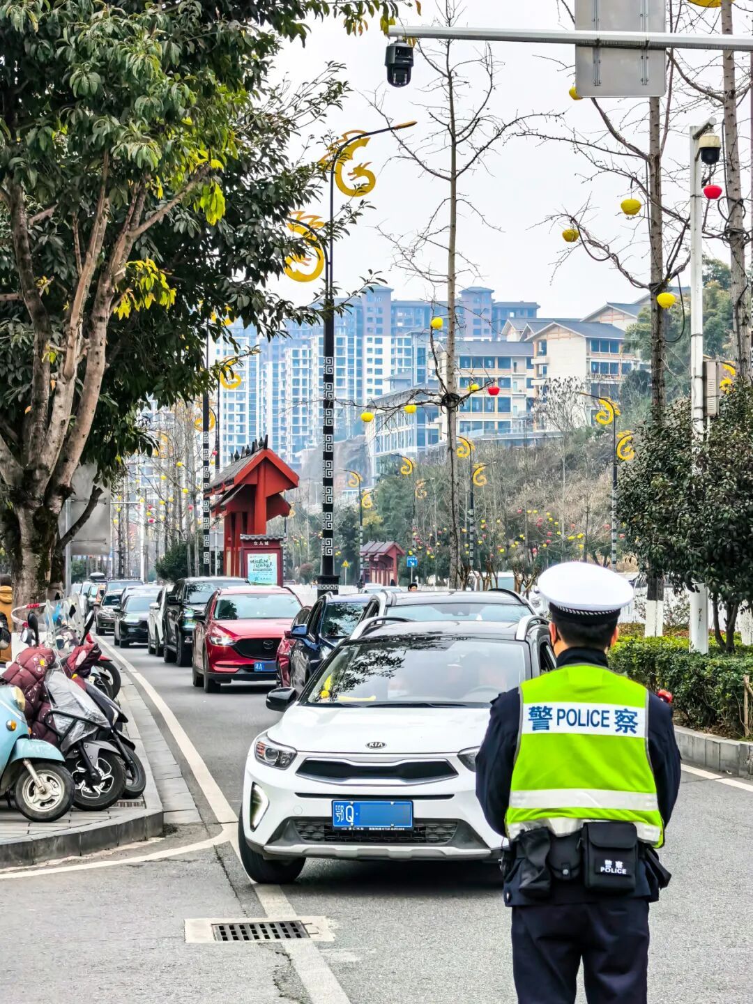 當(dāng)近5萬(wàn)人次的單日客流高峰匯聚女兒城,那抹“藏青藍(lán)”始終挺拔地站在每一個(gè)喧囂的路口。公安民警和特警隊(duì)員們目光如炬,他們不看花燈,只看護(hù)著看花燈的人。交警們的手勢(shì)在車(chē)流中揮動(dòng)了千百遍,只為讓每一條通往“年味”的路都暢通無(wú)阻。