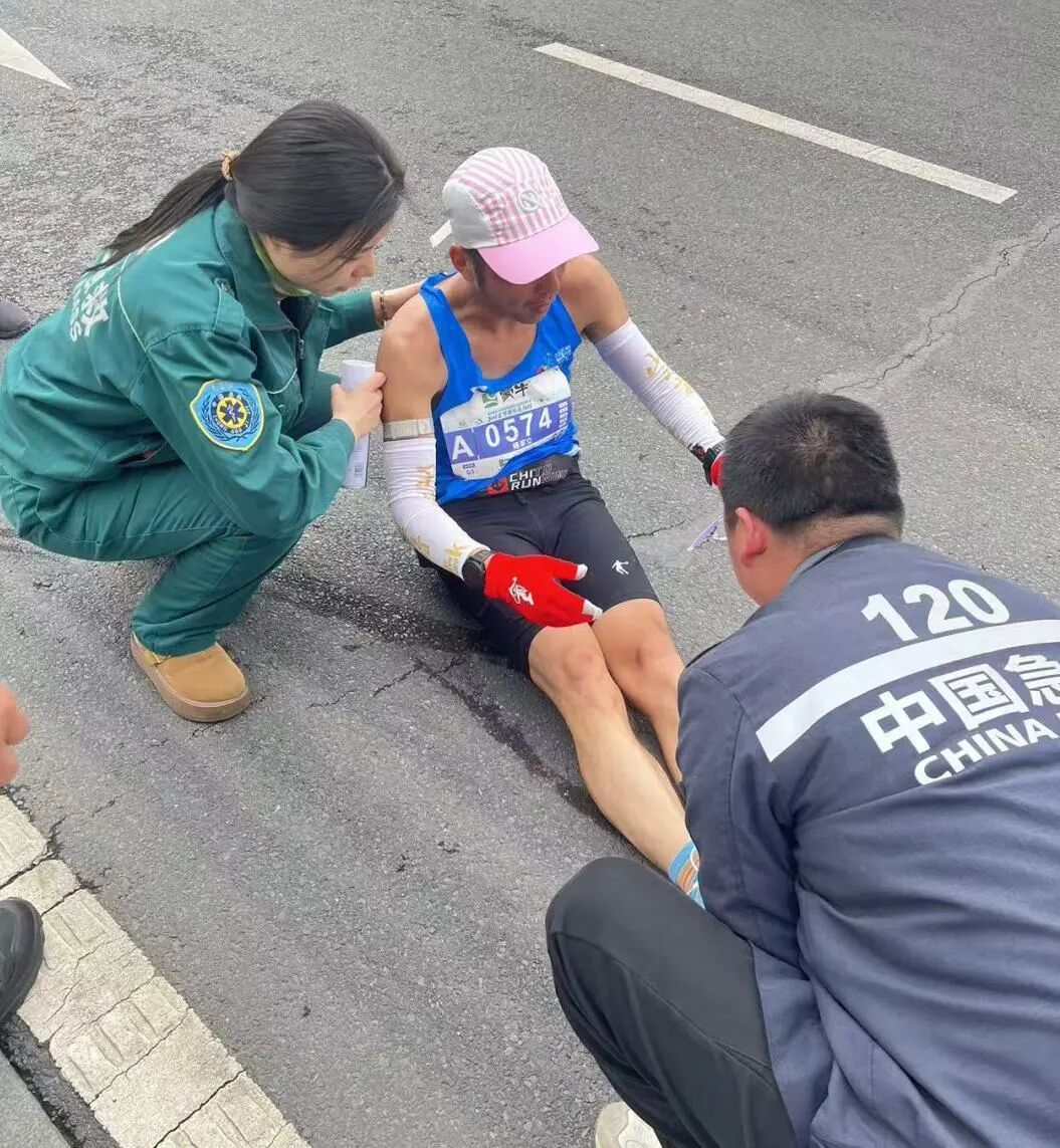 隨著日頭升高,越來越多的跑者沖過終點。而在賽道沿線的醫(yī)療點上,保障工作迎來高峰。