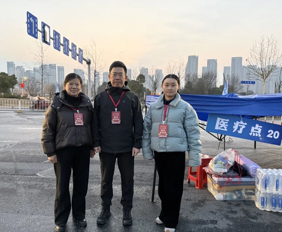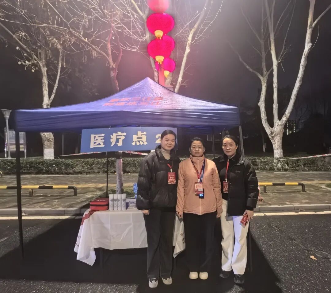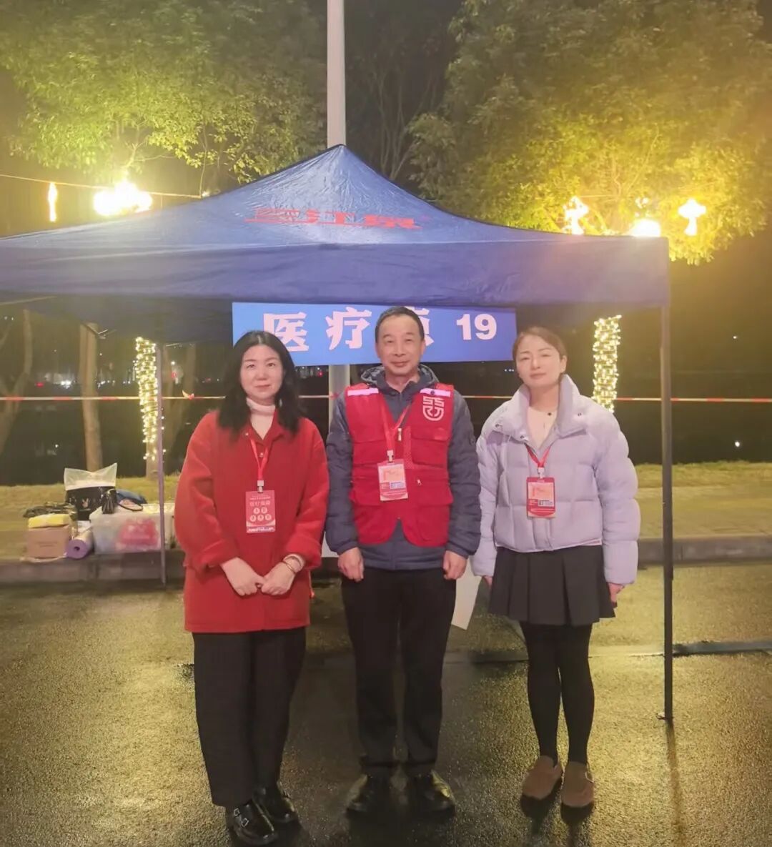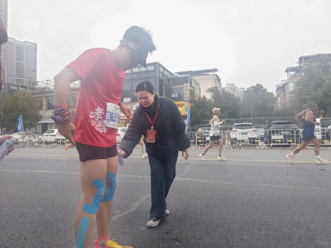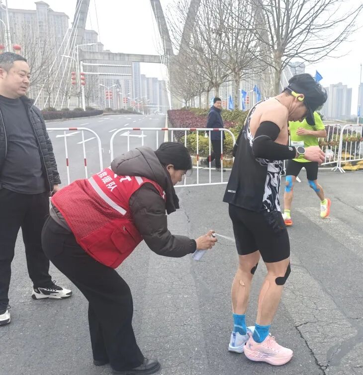 在12.5km處的醫(yī)療站點,醫(yī)生陳杏和護士唐慧賢、祝敏的目光始終追隨著賽道上的每一個身影。這里是半程馬拉松的關鍵節(jié)點,也是選手體能消耗的“預警區(qū)”?!坝信苷叱霈F(xiàn)腿部痙攣,需要處理!”三人迅速進入狀態(tài),噴霧、按摩、補液……一套操作行云流水。