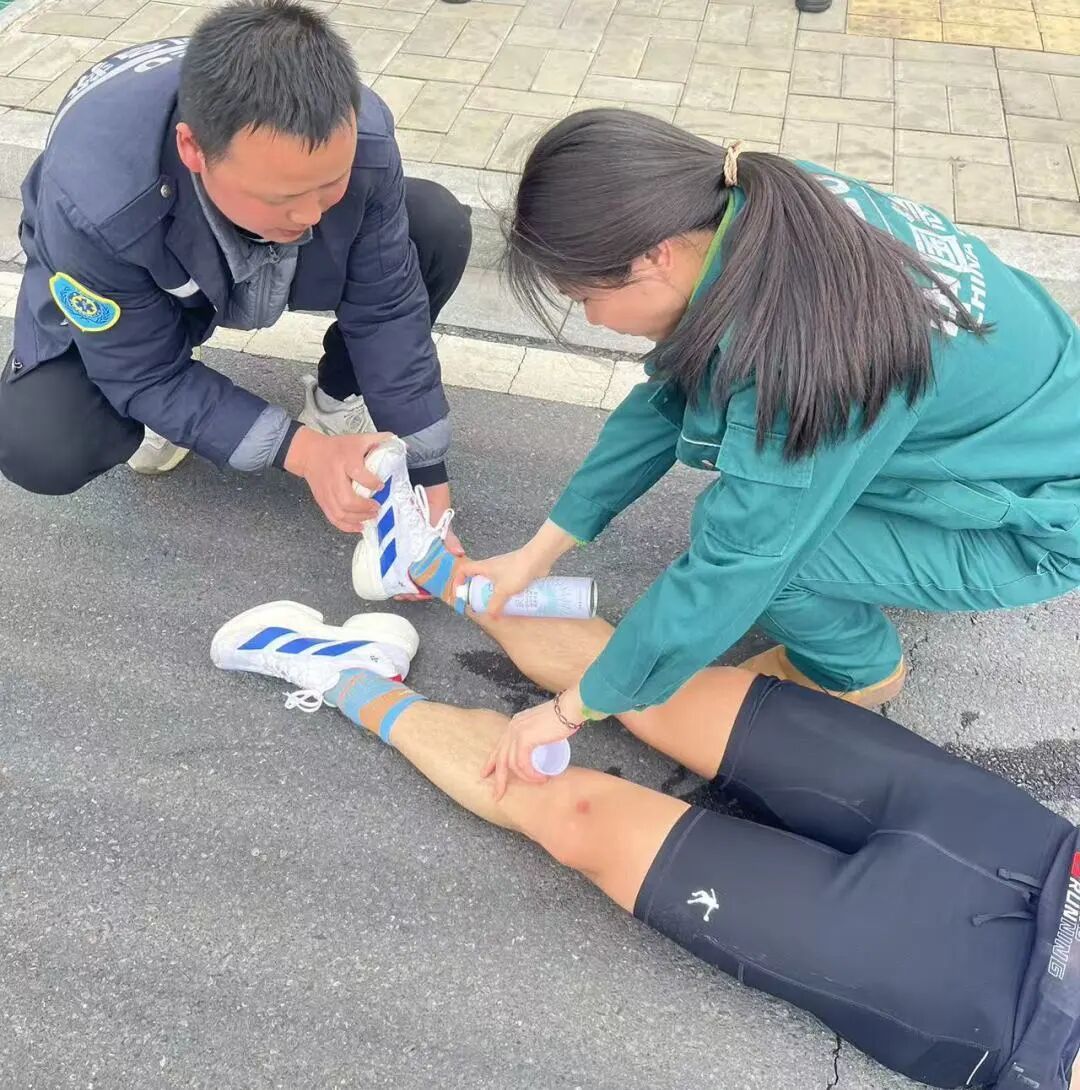 “膝蓋不舒服是嗎?來,坐下我?guī)湍纯??!痹谌R37.5km處,醫(yī)生劉書明已經(jīng)記不清這是第幾次蹲下為跑者處理傷情。肌肉拉傷、關節(jié)扭傷、皮膚擦傷……面對各種常見運動損傷,他和搭檔張春珍、嚴郁婷處置精準,還不忘送上句句加油暖心鼓勵。