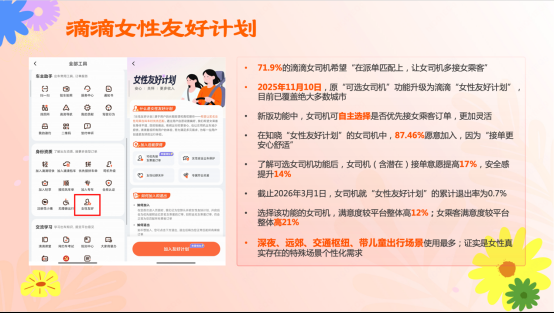 “女性友好計(jì)劃”是滴滴在2025年11月對(duì)“可選女司機(jī)”功能的升級(jí):女乘客可以個(gè)性化設(shè)置偏好,選擇優(yōu)先呼叫女司機(jī)。女司機(jī)也可以自主選擇加入或退出優(yōu)先接女乘客,接單更靈活。據(jù)調(diào)研數(shù)據(jù),該功能使女司機(jī)安全感提升14%,滿意度較平臺(tái)整體高12%。乘客在深夜、遠(yuǎn)郊、交通樞紐、帶兒童出行場(chǎng)景使用該功能最多,證實(shí)是女性真實(shí)存在的特殊場(chǎng)景個(gè)性化需求。