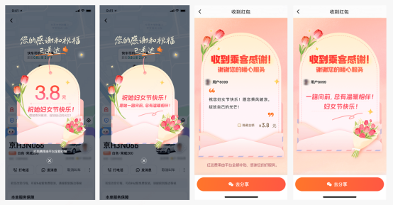 乘客在滴滴App內(nèi)為女司機(jī)送祝福和司機(jī)側(cè)收到的祝福頁面