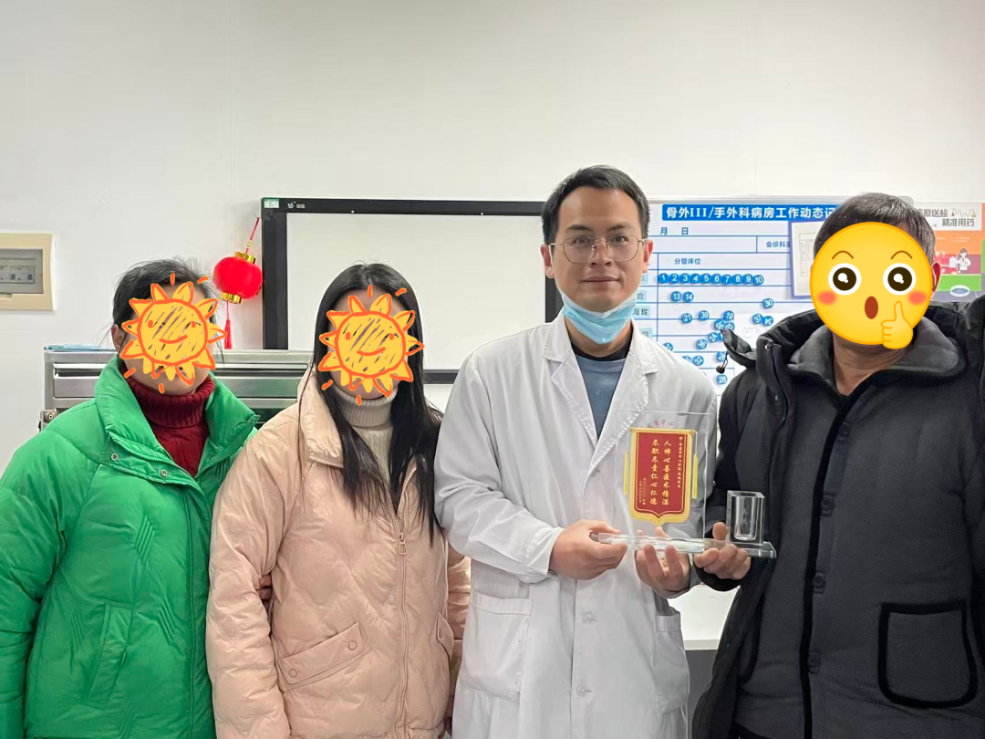 為最大限度保留患者手指功能,醫(yī)療團(tuán)隊(duì)立即制定個(gè)性化手術(shù)方案。手術(shù)從當(dāng)日白天持續(xù)至夜間,吳航在顯微鏡下精準(zhǔn)開展清創(chuàng)、骨支架重建、肌腱縫合、血管神經(jīng)吻合及皮膚修復(fù)等一系列操作。術(shù)后經(jīng)過精心的護(hù)理,龍先生再植的三根手指全部存活,傷口及植皮區(qū)域愈合良好。為了表示感謝,龍先生專程從云夢趕到醫(yī)院,向吳航送上一面水晶錦旗,動情地表示:“多虧了吳醫(yī)生,才讓我的三個(gè)手指全部保住了!”