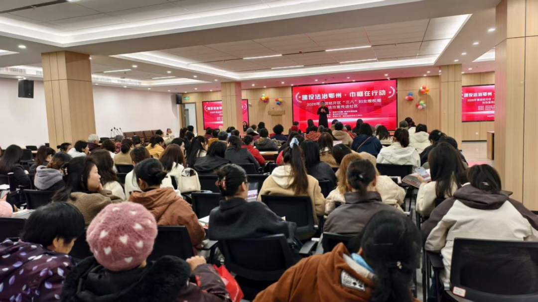 為進(jìn)一步加強(qiáng)婦女法治宣傳教育,提升維權(quán)意識(shí)和能力,助推平安法治鄂州建設(shè),3月5日,在第116個(gè)“三八”國(guó)際勞動(dòng)?jì)D女節(jié)來(lái)臨之際,由鄂州市婦聯(lián)、鄂州市司法局主辦,葛店經(jīng)開(kāi)區(qū)婦聯(lián)承辦,葛店經(jīng)開(kāi)區(qū)新城社區(qū)、湖北省好樂(lè)社工中心協(xié)辦的“建設(shè)法治鄂州·巾幗在行動(dòng)”——2026年葛店經(jīng)開(kāi)區(qū)“三八”婦女維權(quán)周法治宣傳進(jìn)社區(qū)活動(dòng)在新城社區(qū)順利開(kāi)展。來(lái)自市各社區(qū)(村)的婦聯(lián)執(zhí)委、巾幗志愿者及婦女群眾代表等100余人共同參與,現(xiàn)場(chǎng)氣氛熱烈。