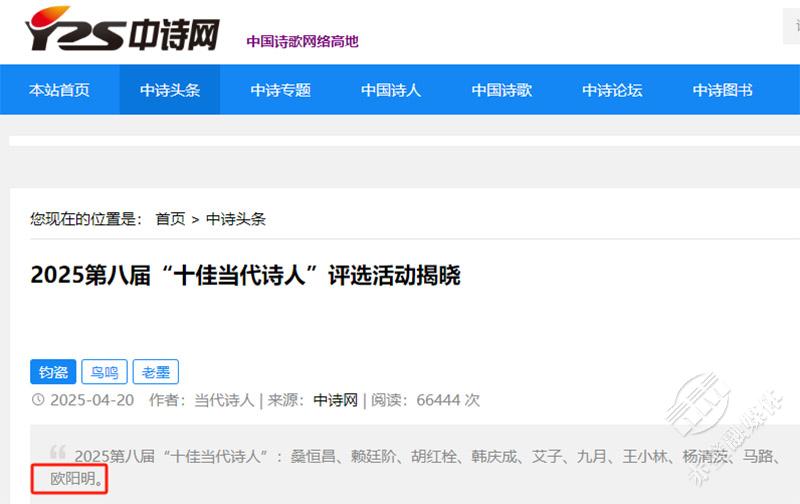 4月20日,2025第八屆“十佳當(dāng)代詩人”評(píng)選活動(dòng)揭曉評(píng)選結(jié)果塵埃落定,赤壁詩人歐陽明光榮上榜,這是赤壁詩人首次在該榜亮相。