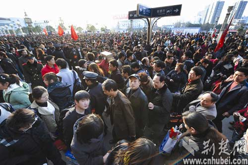 記者今日上午到武昌站轉(zhuǎn)了轉(zhuǎn),和春節(jié)幾天相比,站前廣場(chǎng)的客流明顯增多,幾趟臨客的發(fā)車招牌豎在廣場(chǎng)上,到點(diǎn)會(huì)有引導(dǎo)員引導(dǎo)旅客依次進(jìn)站?梢哉f(shuō)是忙亂中仍然井然有序。據(jù)了解,昨天,鐵路春運(yùn)客流出現(xiàn)新高潮,武漢鐵路局共發(fā)送旅客51.14萬(wàn),再創(chuàng)歷史新高,旅客發(fā)送量約占全國(guó)鐵路旅客發(fā)送量的十分之一。
