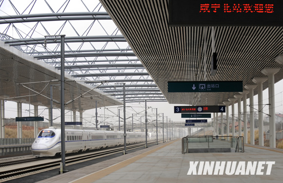 12月26日9時(shí)16分,從武漢始發(fā)的首列動(dòng)車組列車快速通過湖北咸寧北站。 當(dāng)日,武廣高鐵正式通車運(yùn)營(yíng),標(biāo)志著我國(guó)步入高速鐵路新時(shí)代。 新華社記者 皮曙初 攝
